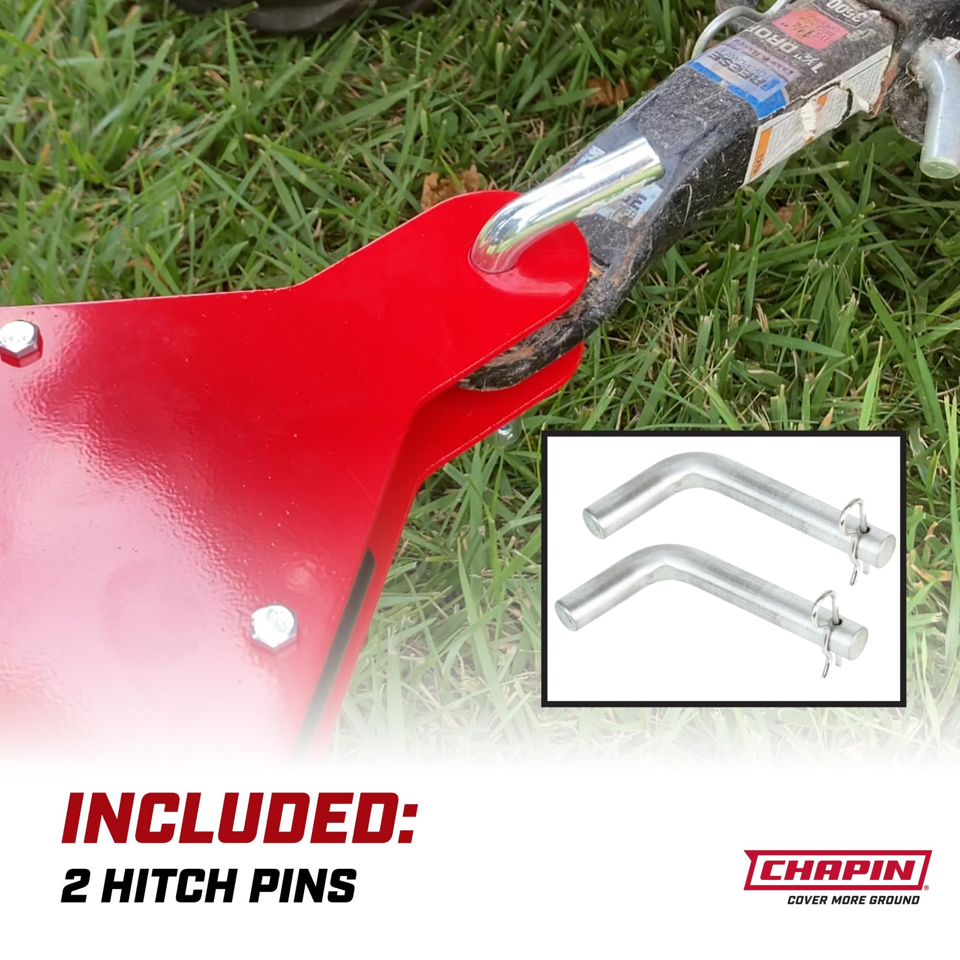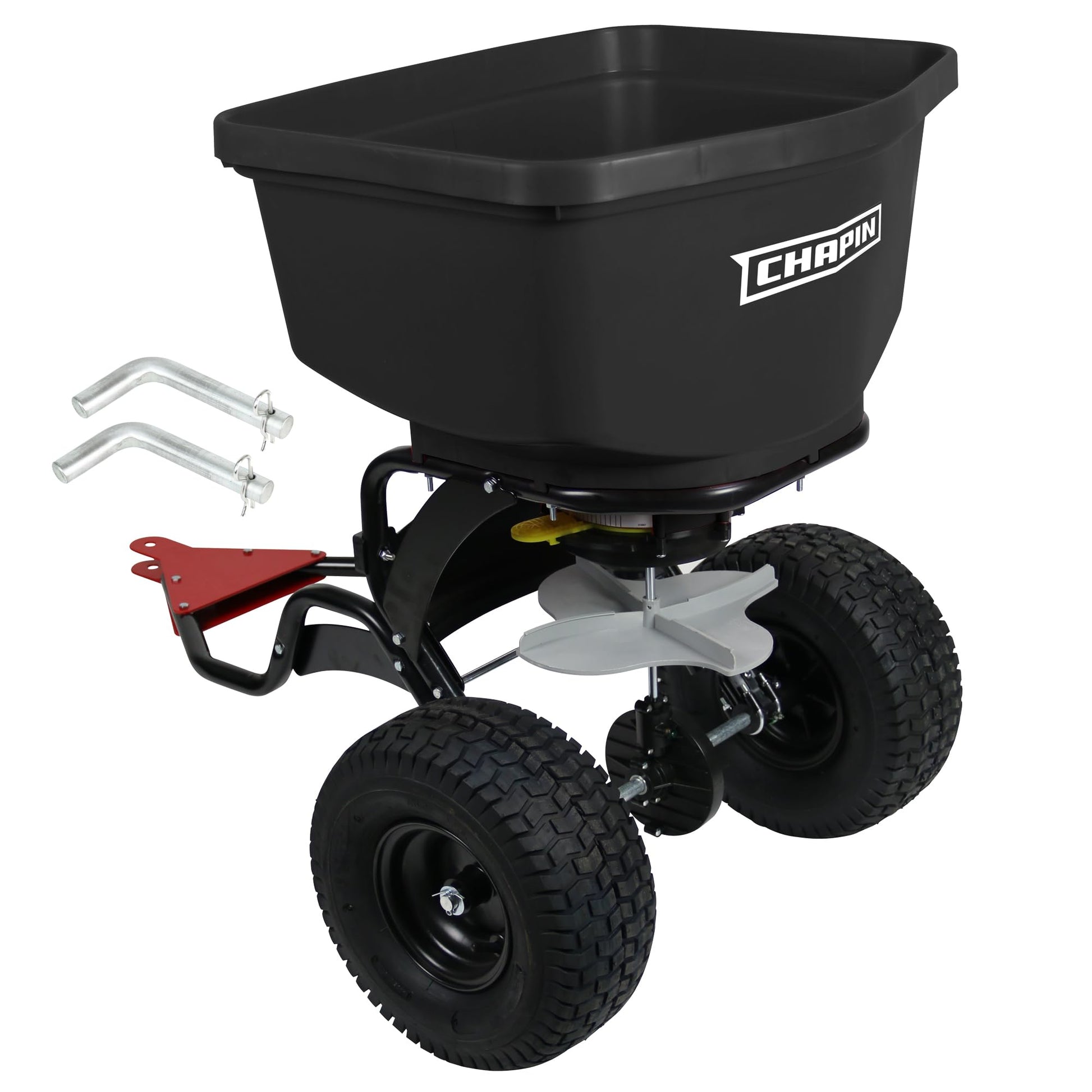 Chapin’s 8622B 2.2 Cubic Feet, tow-behind spreader saves you from reaching back to stop your spreader at the right time, wasting seed or fertilizer in the process. You don’t need to strain your back to stretch and you won’t need to worry about burnt lawns because of uneven applications. Hooks on to a hitch on the back of an ATV, UTV or tractor. The auto-stop dual impeller stops spreading when you’re not moving. It’s constructed to handle tough terrain around your farm, field and acreage. The 2.2 cubic feet capacity hopper is made from rust-resistant black poly and it’s supported on a powder-coated steel frame. There’s 11 incremental gate adjustments so you can dial in your mix to fit your application. Bonus, two hitch pins are included. This unit not recommended for use with sand and sand mixes. Made in the USA with global materials and backed by Chapin’s limited lifetime warranty.