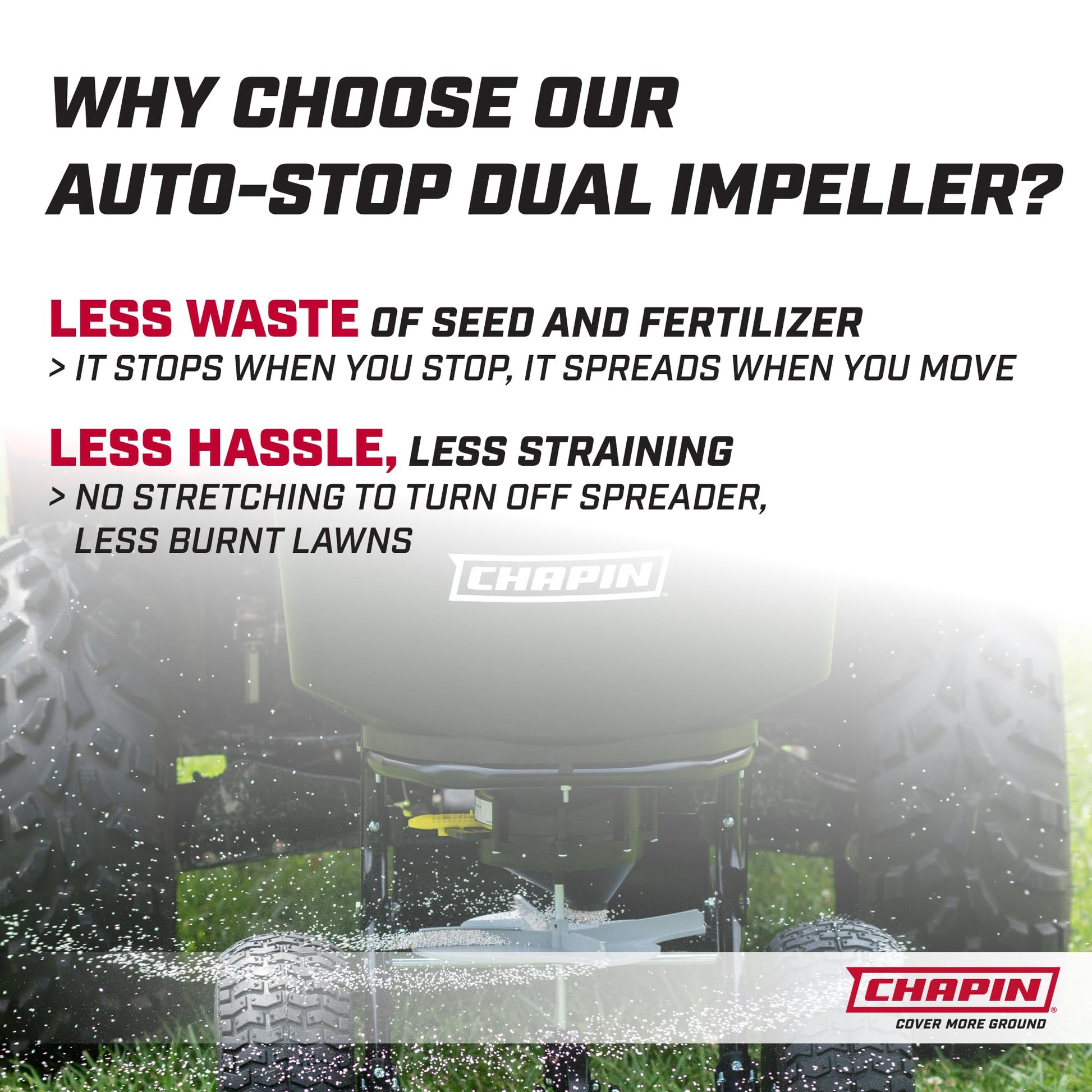 - AUTO-STOP DUAL IMPELLER: this allows for less waste of seed or fertilizer from constantly reaching back and turning off your spreader when you stop moving; less stretching and straining or worrying about burnt lawns due to an uneven application of product