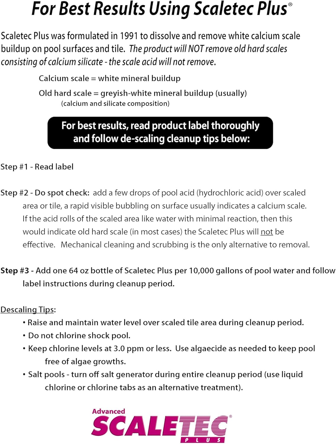 This pool surface and tile descale plus iron stain remover. Removes calcium buildup without scrubbing, acids, or pool draining. First pourable surface, tile, and equipment descale. Controls all metals and prevents staining. Scaletec features descales all pool surfaces and tile without acids, scrubbing and draining. Does not damage pool surfaces. Safer and more effective than acid washing pool surfaces. Very effective on removing calcium deposits, mineral scales, iron stains, and scum buildup. Cleans pool equipment, filter and heater. Obtain visible results in 2 to 4 weeks. Comes in 64-ounce container. Includes 8 containers per pack.