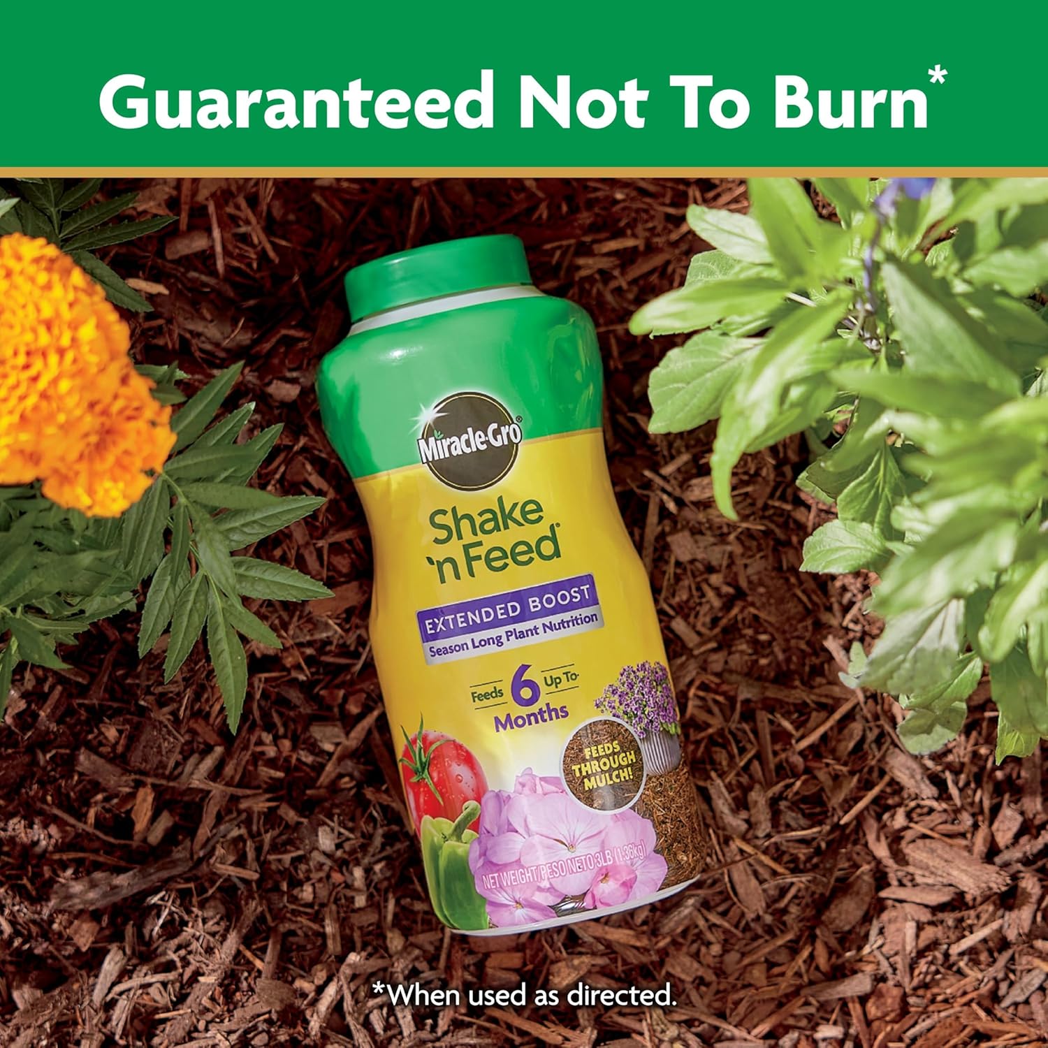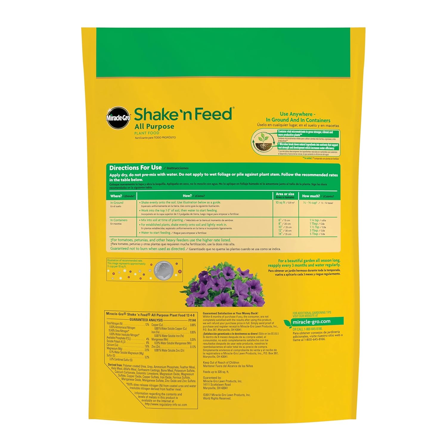 Nourish your plants above and below the soil with Miracle-Gro® Shake 'N Feed® All Purpose Plant Food. This plant food contains natural ingredients to feed microbes in the soil (microbes break down natural ingredients into nutrients that support root strength and development which increases water efficiency). In addition, this garden product feeds plants for up to 3 months, and contains vital micronutrients to grow stronger, vibrant, and more productive plants (vs unfed). This all-purpose plant food may be used with most plants in ground or in containers. Apply this gardening product dry; do not pre-mix with water. When applying to in-ground plants, shake evenly onto the soil and work into the top 1-3 inches of soil. When using with container plants, mix into the soil at time of planting, or shake evenly onto the soil of established plants and lightly work in. For all plants, water to start feeding, and use the recommended rates provided on the label. For a beautiful garden all season long, reapply Miracle-Gro® Shake 'N Feed® All Purpose Plant Food every 3 months and water plants regularly.