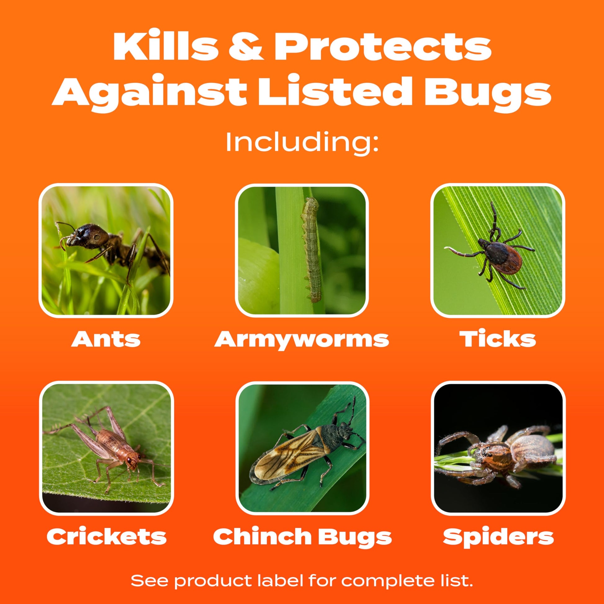 - Controls listed lawn insects like ants, armyworms, chinch bugs, crickets, fleas, grasshoppers, spiders, and ticks